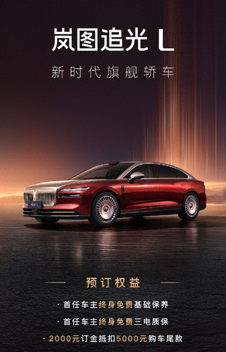 岚图追光L的外观静态部分已经在2025年成都车展上亮相,新车本次官方公布了更多细节。首先新车本次提供了三大预定权益,包括首任车主终身免费基础保养、首任车主终身免费三电质保,另外还有2000元定金抵扣5000元购车尾款福利。